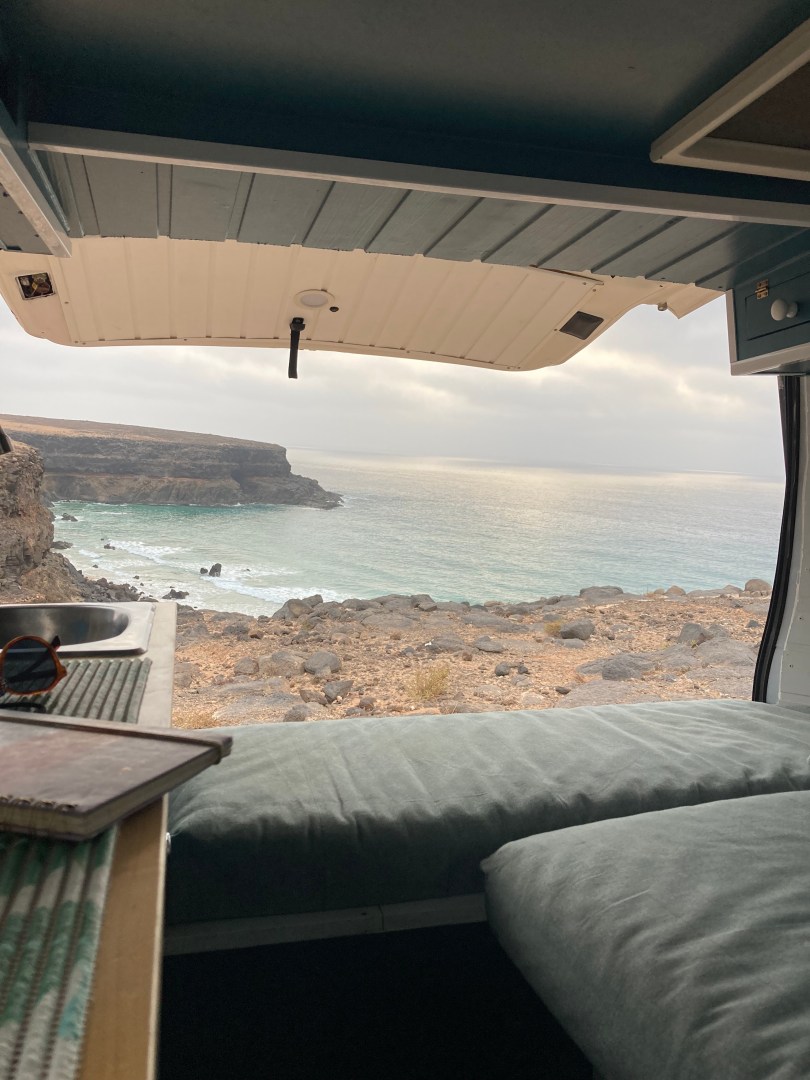Een paar dagen later ben ik voor de eerste keer alleen gaan kamperen hier op Fuerteventura. Ik ben naar Esquinzo gereden, dat is een plek aan de westkust want ik wilde graag de zonsondergang daar zien. Surfboard in m’n busje geladen en gaan rijden. Ook de weg naar Esquinzo is onverhard en dat vind ik nog echt heel erg spannend. Maar ook hier weer een perfecte spot gevonden om te parkeren en met mijn achterklep open kon ik op mijn bed liggen en naar de zee kijken. Esquinzo is echt prachtig, het is een soort baai, heeft hoge kliffen en een super blauwe zee. Om op het strand te komen moet je via de rotsen naar beneden klimmen dus ik nam mijn surfboard mee en ging op pad. Niet veel gesurfd, want ik vond het te spannend en het lukte dus niet. Maar ‘s avonds heel erg genoten van het in en om mijn busje hangen met dit uitzicht (helaas zonder mooie zonsondergang want iets te bewolkt) en ik val in herhaling, maar in de ochtend je deuren kunnen openen en wakker worden aan zee is het beste wat er is.