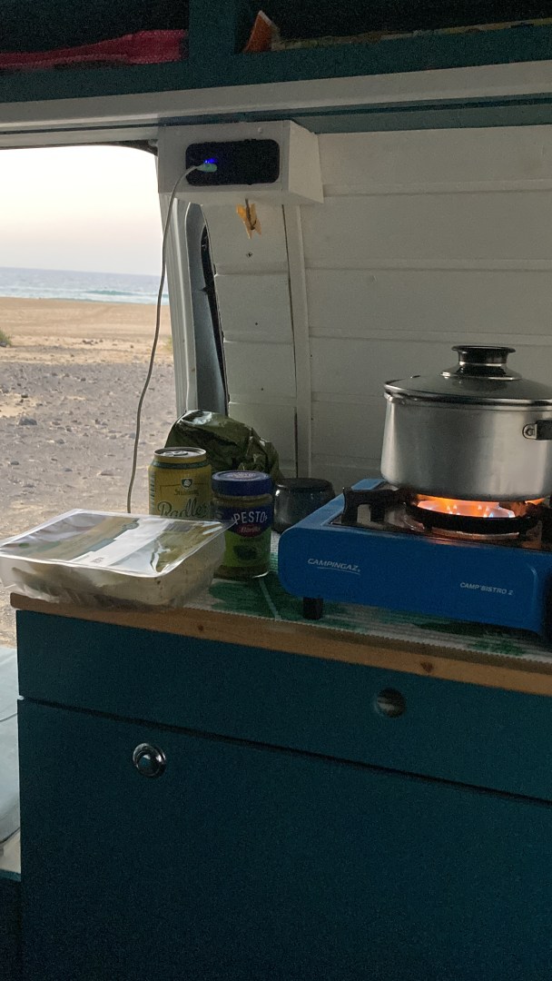 Genoeg geklaagd nu, ik begon trek te krijgen en besloot wat eten voor mezelf klaar te maken. Ik had van thuis een pasta meegenomen en ik besloot die te koken en met wat pesto te eten. Ik heb een gasstelletje met één pit, dus ik ben nog een beetje zoekende in wat ik daarmee kan klaarmaken. De zon was ondertussen onder en het werd langzaam steeds donkerder. Biertje erbij en ik was lekker in de relax modus in mijn busje. Ik was er vooral op aan het wachten wanneer het echt donker zou zijn om naar de sterren te kunnen kijken. Gelukkig was het die avond heel helder, want Cofete ligt zo afgelegen dat er geen lichtvervuiling is en je dus heel goed sterren kunt kijken!