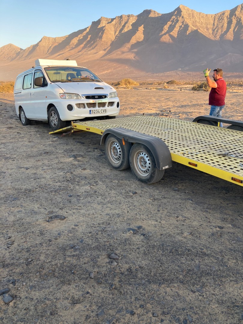 Na een rit van ongeveer 1,5 uur waren we weer in de bewoonde wereld en werd ik gedropt bij de haven van Morro Jable waar ik mijn verzekering kon bellen dat ze me daar konden ophalen met de sleepwagen. Dit duurde gelukkig niet zo lang en toen kon mijn auto op sleepwagen 2 geladen worden. Deze Spanjaard had haast en reed met een flinke snelheid en al bellend richting het noorden. Toen deelde hij mee dat we nog van sleepwagen gingen wisselen, omdat hij alleen het zuiden deed. Zolang hij me niet alleen liet staan met mijn auto daar vond ik alles best op dat moment. Gelukkig kwam de andere sleepwagen al heel snel en werd mijn auto van sleepwagen 2 op sleepwagen 3 gezet. Deze man reed ongeveer de helft van de snelheid van zijn voorganger, dus ik moest ergens ook wel lachen om dit verschil. Gelukkig hoefde ik niet sociaal te doen en kwamen we langzaam maar zeker steeds dichterbij huis. De beste man heeft mijn auto op de parkeerplaats gezet, me verzekerd dat het wel goed kwam en rond een uur of elf ´s avonds was ik eindelijk thuis.